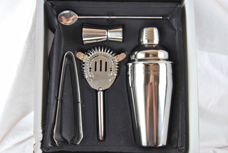 Alpine Cusine Bar Set. Stainless Steel Includes 3 Part Strainning Shaker with Lid, Gigger, Ice Tongs, Strainner and Stirrer. New in Box