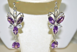 Ladies Designer Butterfly Silver Tone Amethyst Drop Pierced Earrings.