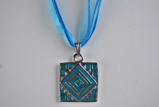 Ladies Designer Necklace with Modern Blue Aztec Design & Ribbon Cord.