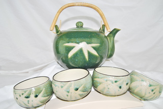 Chinese Tea Pot and Cups, Jade Green with Bamboo Design & Woven Handle, Tea Pot & 4 Cups.