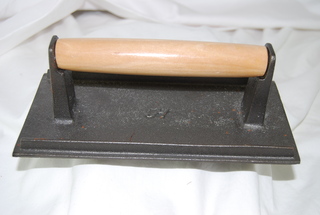 Cast Iron Cooking Press with wooden heat resistant handle. 12"L x 5"W.