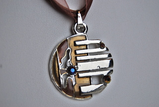 Ladies Designer Amber & Silver Cloisonne Design Necklace on Brown Ribbon Rope Cord.