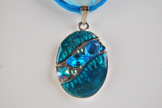 Ladies Designer Blue Crystal & Cloisonne Design Necklace on Blue Ribbon Rope Cord.
