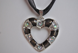 Ladies Designer Black Heart & Crystal Cloisonne Necklace on Black Ribbon Rope Cord.