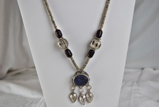 Ladies Designer 24" Tribal Design Lapis with Burnished Silver & Wooden Beads Necklace.