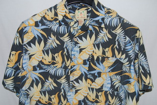 Joe Marlin's Men's Designer Casual Shirt, 2XL, Grey with Blue & Gold Hawaiian Design, Wooden Buttons, 65% Rayon, 35% Polyester, new without tags.