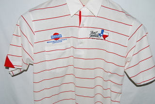 Nissan Embroidered Polo Shirt, Large, White with Red Pinstripe, Emblem of Nissan & Fort Worth Auto Auction, 60% Cotton, 40% Polyester, new without tags.