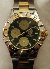 Men's Polo Designer Two-Tone Quartz Watches, Gold and Black face, bold bezel and a stylish watch style band.