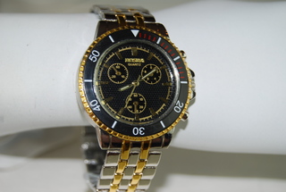 Men's Rosra Designer Silver Tone Quartz Bracelet Watch with Black Face and White Trim.
