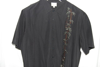 Trader Bay Men's Designer Casual Shirt, 2XL, Black with Embroidered Bamboo Leaf Design, Short Sleeve, 74% Rayon & 26% Polyster, new without tags.
