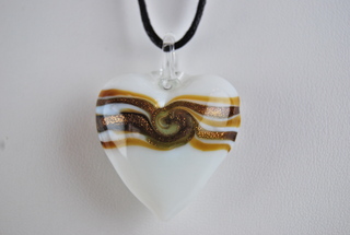 Ladies Murano Hand Blown Glass Heart Necklace with White & Gold Metallic Swirl Design on 18" Rope Cord.