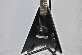 Vintage Custom Scott Dixon Flying V, Solid Body 6-String Electric Guitar. 2 Double Humbucker Pick-Ups, Volume and Tone Knob, 22 Fret Rosewood Fingerboard., Whammy Bar, Gloss Black Finish with Custom Case. Excellent Condition, Like New.