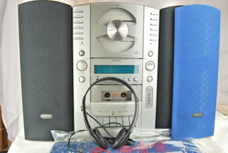 Sharper Image Portable CD/ AM-FM/ Cassette Deck, Alarm Clock, Remote Control, Open Box, Tested, Excellent Condition, Headphone Jacks, Equalizer, Detachable Speakers with Extra Set of Blue Speaker Covers, Wall Mountable or Table Standing, 110v. & Battery Operation. Batteries not included.