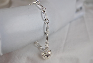 Ladies Designer 7" Silver Stainless Large Oval Link with Embossed Heart Charm Bracelet.