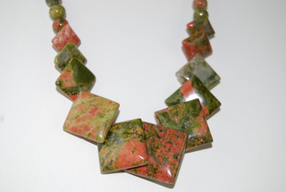 Ladies Designer 18" Natural "Unakite" Gemstone Necklace in Square & Round Bead Design.